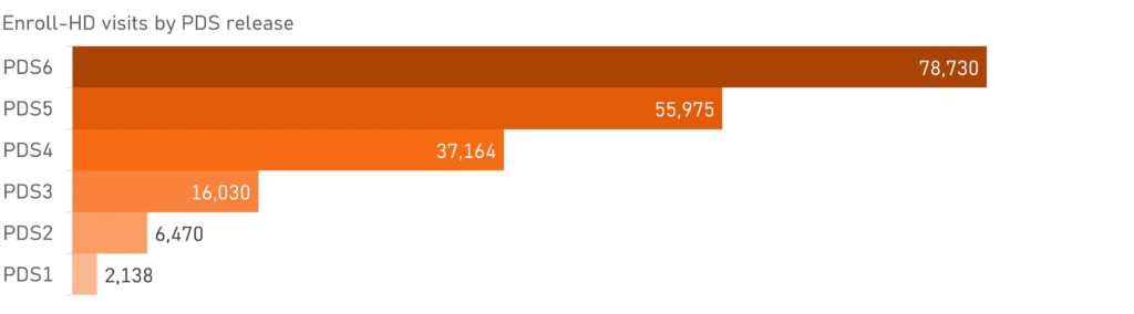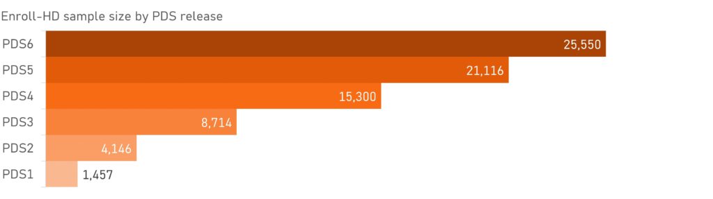 PDS6 contient des données de 25 550 participants à l’étude Enroll-HD. Données de 95 040 visites d'étude sont inclus, ce qui en fait l’un des plus grands ensembles de données de cohorte mis à la disposition des chercheurs.